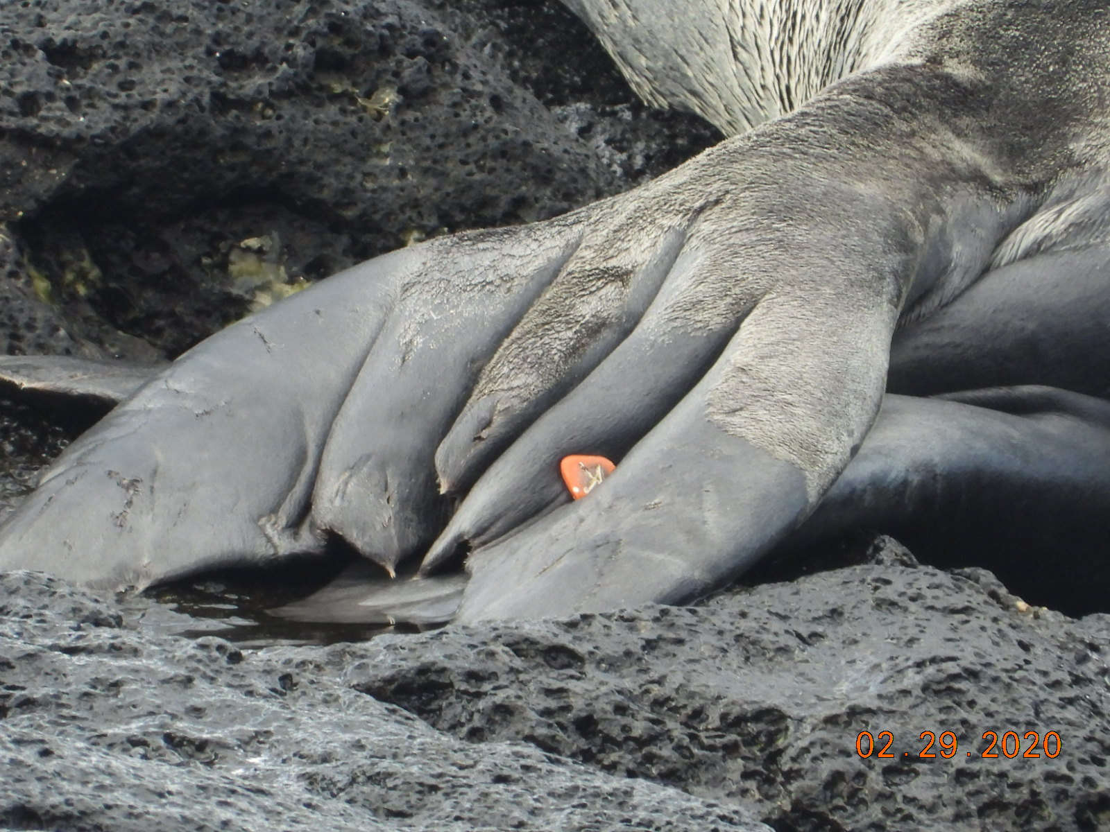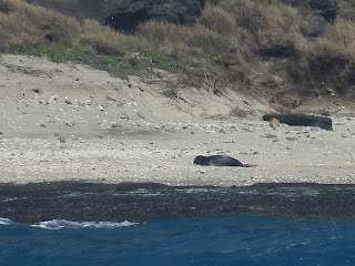 Marilyn viewed Rabbit Island from Kaupo Beach park this morning for about half hour. When she first viewed the island Mom and PO1 were joined by another adult/sub-adult seal very close. The UU rolled over and was directly looking at Mom & PO1, and Mom reacted challenging the UU and then moved away. Today Marilyn was able to observe and get a decent photo of Mom's ventral side, she appears to have a darker patch in her upper left side. She remains a mystery mom with another hint! We also think PO1 may have a fairly large natural bleach inside its LFF.